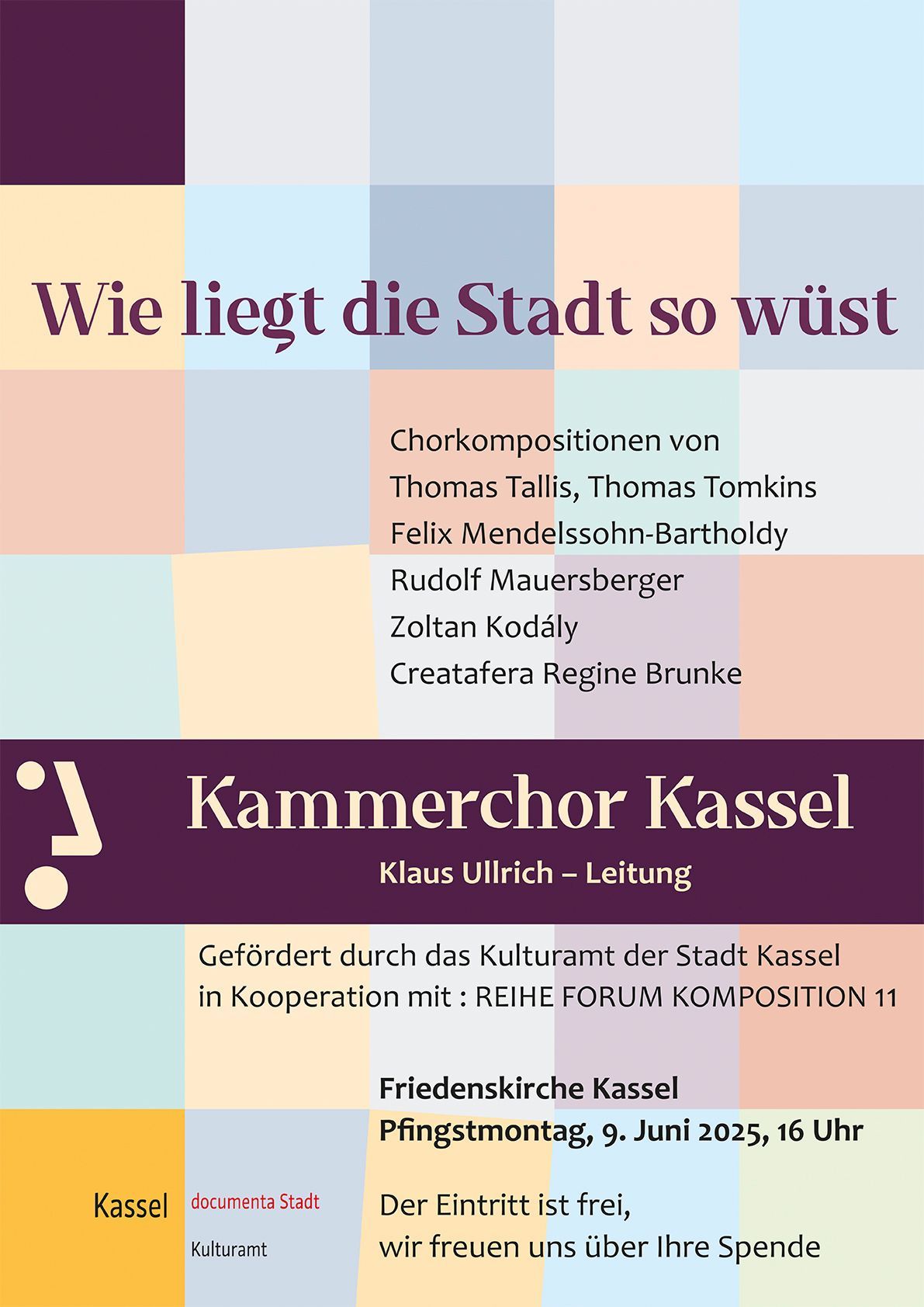 Zum 50. Todestag der Dichterin Mascha Kaléko (1907 – 1975) – aufgewachsen in Berlin, Exil in New York, gestorben in Jerusalem – schrieb die Kasseler Komponistin Regine Brunke drei Chansons für gemischen Chor a cappella zu von Mascha Kaléko. Sie hören im Konzert die Uraufführung dieser Werke.